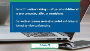 Callout 3: Laptop open on desk with phone - BetterCE's online training facts listed from text