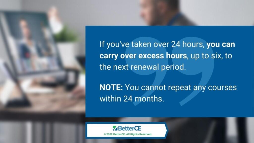 If you’ve been especially diligent in completing your continuing education to the point of taking over 24 hours, you can carry over excess hours, up to six, to the next renewal period. In addition, you cannot repeat any courses within 24 months.