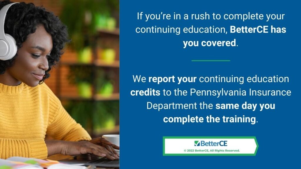 Note that our office will report your continuing education course credits to the Pennsylvania Insurance Department the same day you complete the training. So, if you’re in a rush to complete your continuing education, we’ve got you covered.