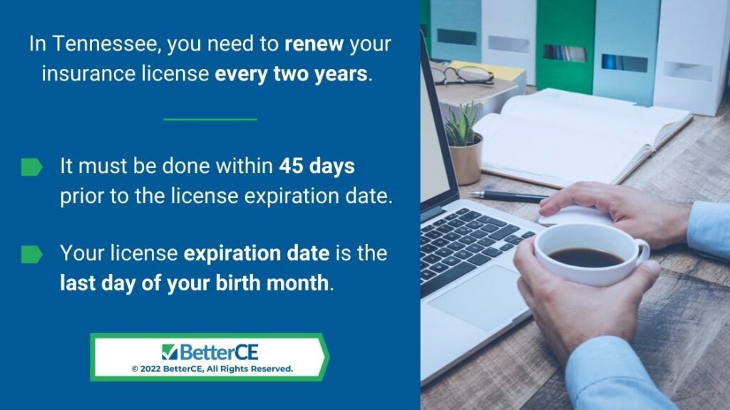 Every two years you need to renew your insurance license. This must be done within 45 days prior to the license expiration date. Your license expiration date is the last day of your birth month. If you are not certain of your license expiration date year, you can find it at Tennessee Agent Lookup