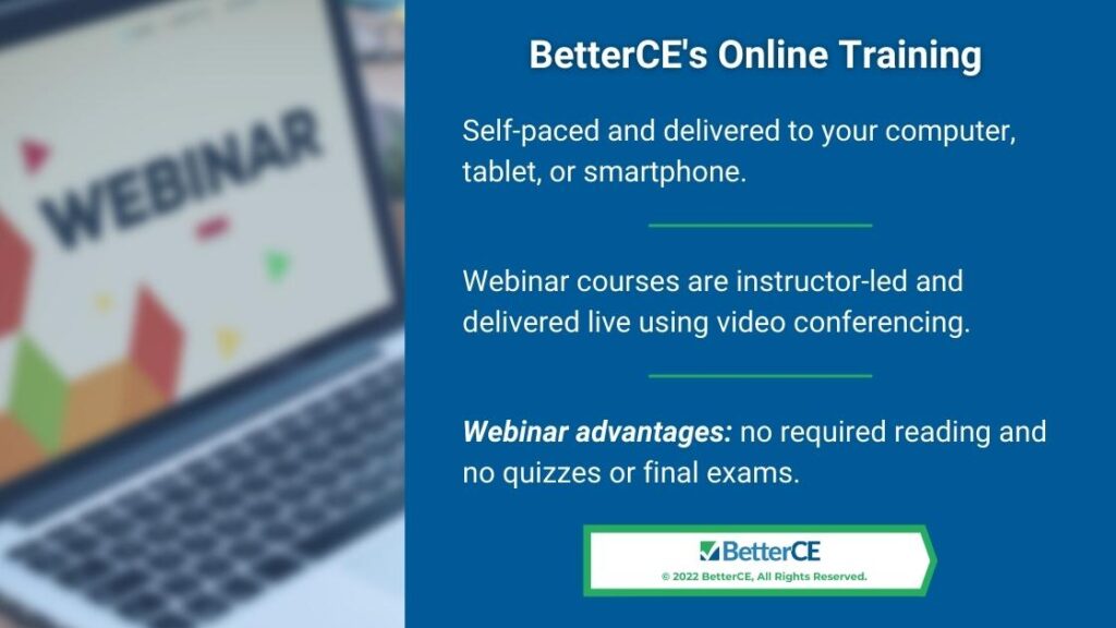 Our webinar courses are instructor-led and delivered live using video conferencing. You’re required to be in attendance for the entire class time, with check-ins at random times throughout the webinar to confirm your attendance. Students can interact and ask questions. The advantages of webinars include no required reading and no quizzes or final exams. You can view a listing of our webinars here: Tennessee Webinar Catalog.