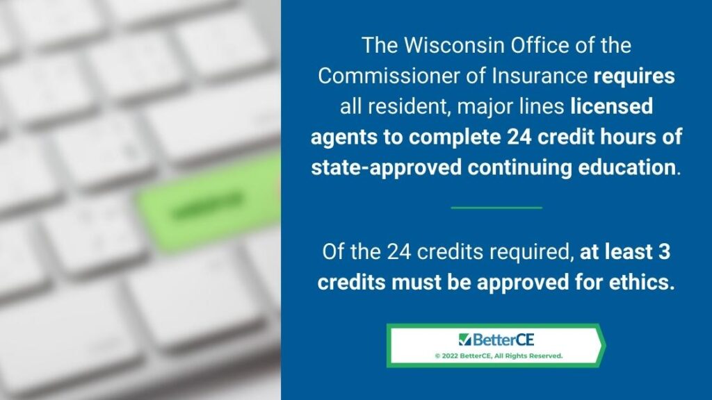 The Wisconsin Office of the Commissioner of Insurance requires that all resident, major lines licensed agents complete 24 credit hours of state-approved continuing education every two years. Major lines are those agents who are licensed to sell: Life, Accident, and Health; Property; Casualty; and Personal Lines coverages. Of the 24 credits required, at least 3 credits must be approved for ethics.