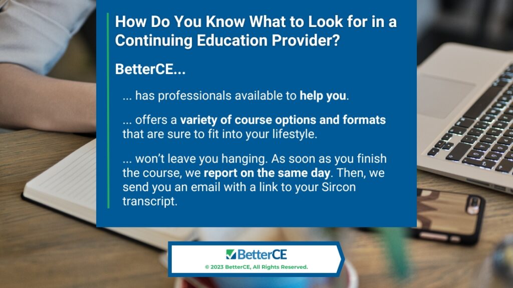 Callout 1: Person at desk taking notes in front of laptop- How do you know what to look for in a continuing education provider? three BetterCE benefits