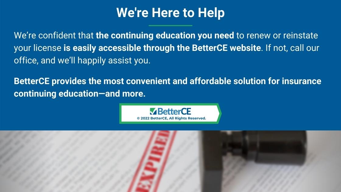 Callout 3: red expired stamp on document- BetterCE provides the most convenient and affordable solution for insurance continuing education