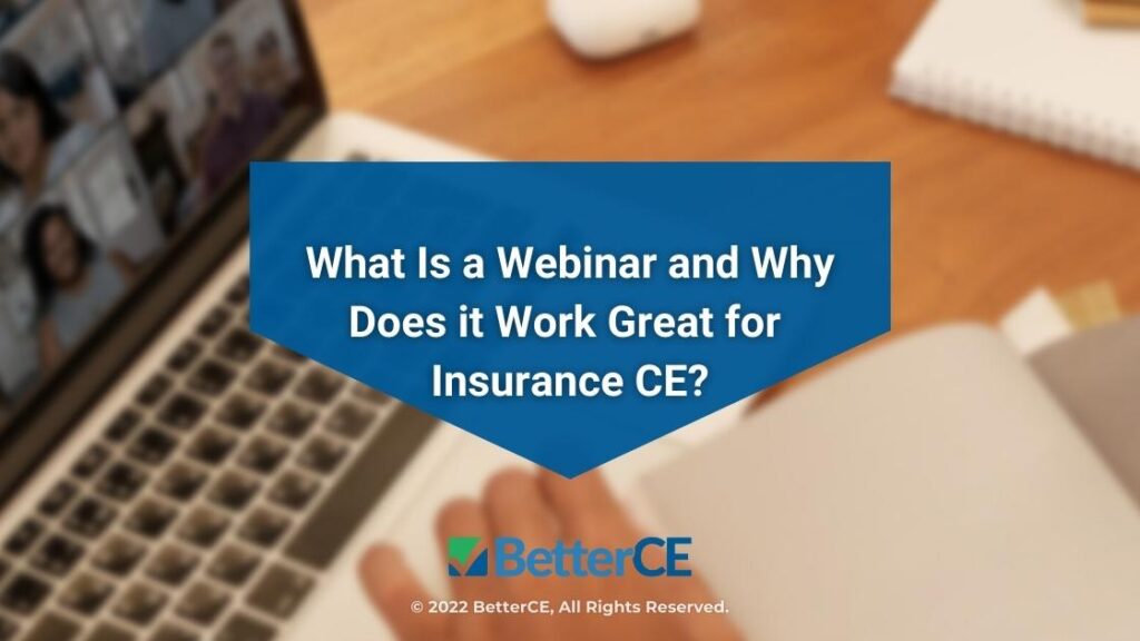 Insurance continuing education is a perfect subject matter for webinar training. We should know. We’ve been delivering insurance CE for years using webinars and text-based self-paced online training. This article covers the broad definition of a webinar and how it’s used in insurance continuing education. That includes the compelling benefits of insurance CE webinars, including no final exam.